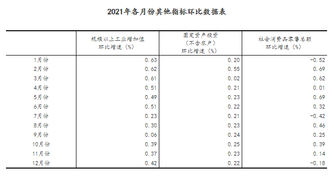 (2)根据季节调整模型自动修正结果,对近一年来各期国内生产总值、规模以上工业增加值、固定资产投资(不含农户)、社会消费品零售总额环比增速进行修订。修订结果及2021年四季度GDP环比数据、2021年12月份其他指标环比数据如下: