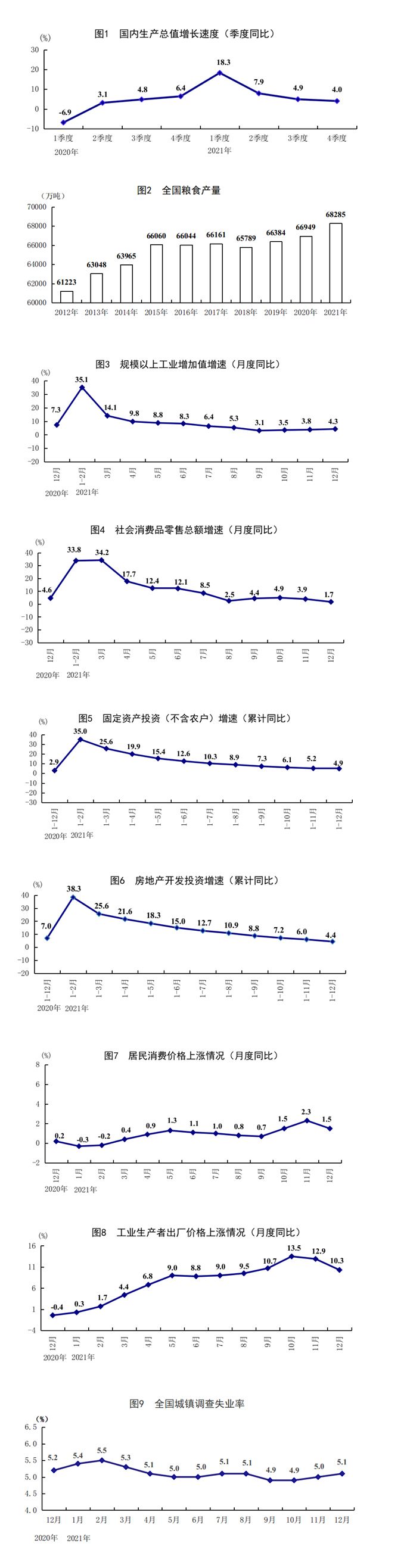 总的来看,2021年我国经济持续稳定恢复,经济发展和疫情防控保持全球领先地位,主要指标实现预期目标。同时也要看到,外部环境更趋复杂严峻和不确定,国内经济面临需求收缩、供给冲击、预期转弱三重压力。下阶段,要坚持以习近平新时代中国特色社会主义思想为指导,全面贯彻落实党的十九大和十九届历次全会精神,认真贯彻中央经济工作会议精神,坚持稳中求进工作总基调,完整、准确、全面贯彻新发展理念,加快构建新发展格局,推动高质量发展,科学统筹疫情防控和经济社会发展,继续做好“六稳”“六保”工作,着力稳定宏观经济大盘,保持经济运行在合理区间,保持社会大局稳定,以实际行动迎接党的二十大胜利召开。
